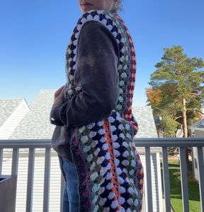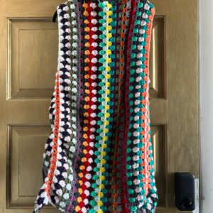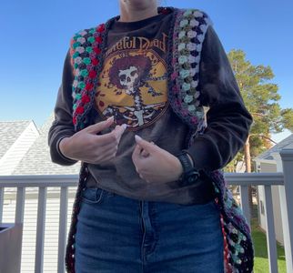 All the colors crochet vest. Fits best on an xs-s, but is long. Machine wash gentle cycle. Includes s&h. I think it would be so pretty over a black dress.