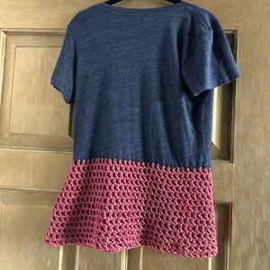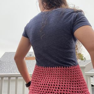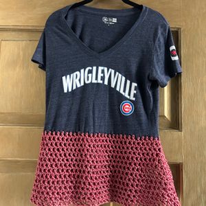 Chicago Cubs Wrigleyville shirt with crochet (done by me) bottom. Red yarn gives a flirty see through bottom and is a bamboo blend to keep you cool during summer games. One of a kind fan gear! Machine washable gentle cycle. Size small. Includes s&h.