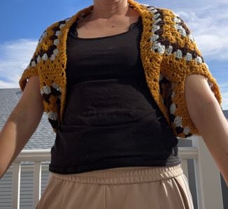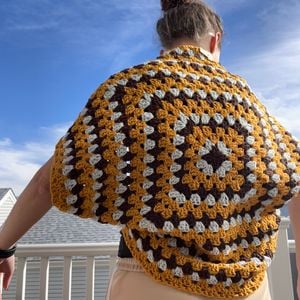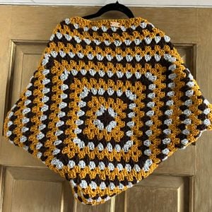 Cozy crochet shrug sweater in a mustard, brown, and light gray color pattern. Fits a variety of sizes, best is a med. machine washable, gentle cycle. Includes s&h. Perfect Thanksgiving fit.