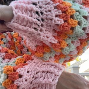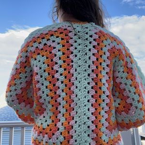 Handmade crochet cardigan. Colors remind me of sherbet! Soft and cozy oranges, pink, and mint green. Machine washable, gentle cycle. Includes s&h.