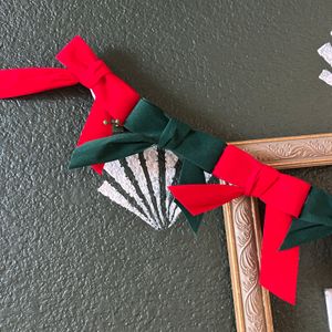 Holiday garland made of red and green bows from vintage velventine ribbon. Bows have been hot glued together, so best to use indoors. Measures about 3.5’. Includes s&h.