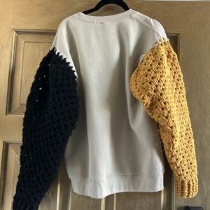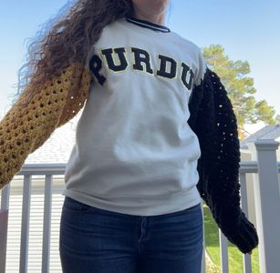 One of a kind Purdue sweatshirt with crochet sleeves (done by me). Size small with puffy sleeves. Fits on the smaller size (more like an xs through body). Machine washable, gentle cycle. Fun, unique game day fit. Includes s&h.