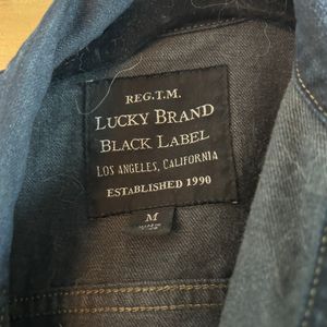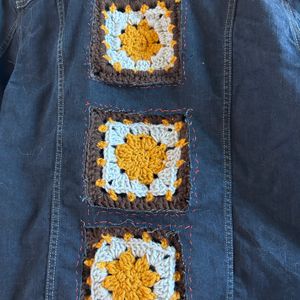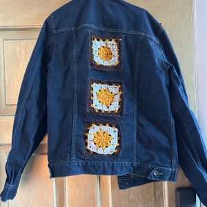 One of a kind denim jacket with crochet back. Lucky brand medium. Crochet granny squares have been hand stitched in with a raw denim edge. Machine wash gentle cycle if necessary. Includes s&h.